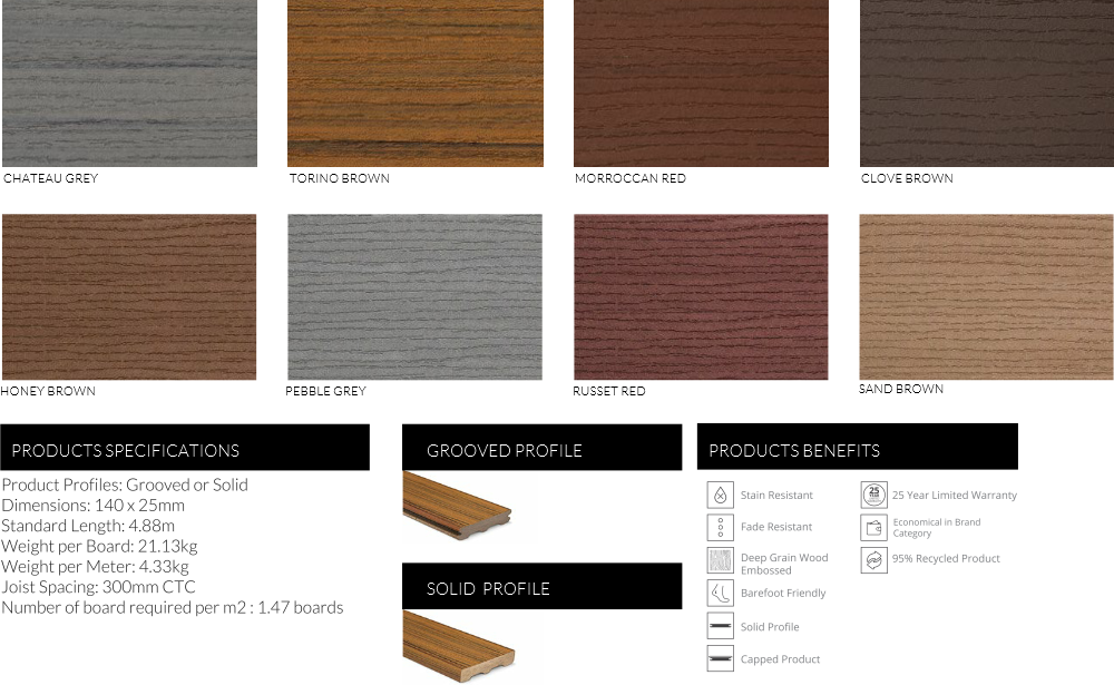 Engineered to maintain the same strength and durability of the traditional Bespoke Decking composite core, wrapped in a modified protective shell, the Contour range offers long lasting performance against fade, stain, mould and mildew, while taking affordability into account.