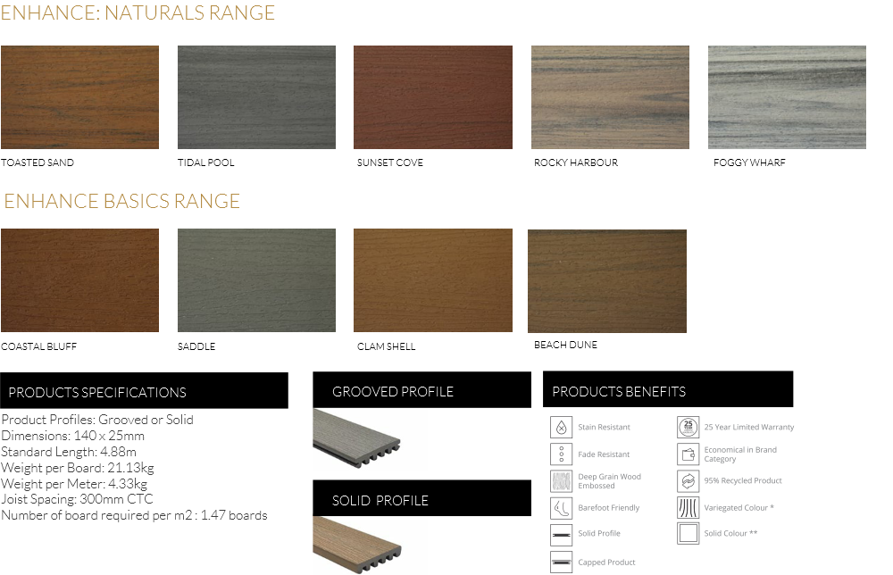 The Enhance profile has been re-engineered to retain the strength and performance Bespoke Decking is known for, while becoming more economical at the same time. The Enhance range maintains the design and engineering for long lasting durability and performance but provides unprecedented value.